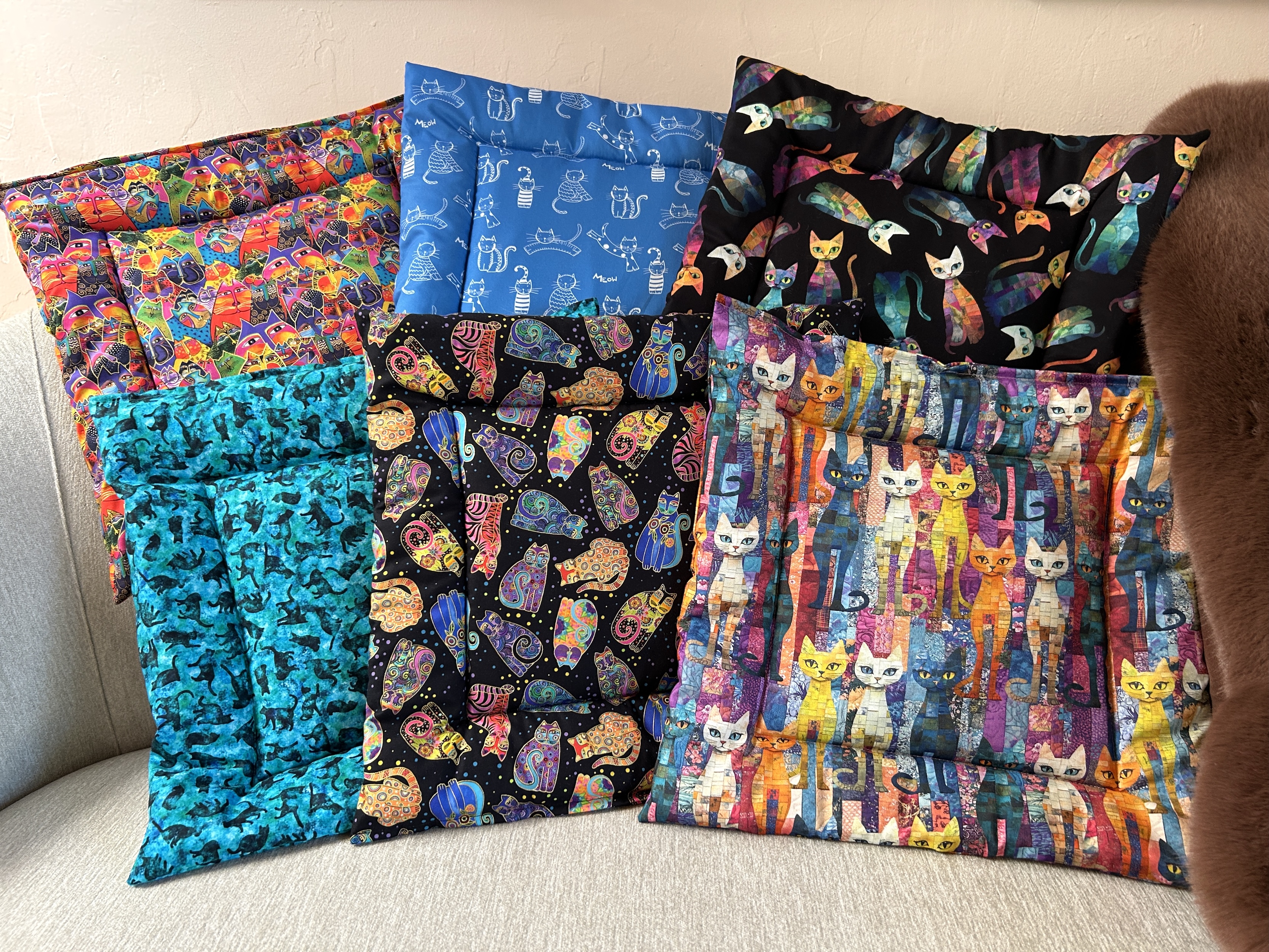 Colorful catnip mats are 16 inches square, with a handful of catnip sewn into the middle of two layers of heavyweight cushy polyester batting. Generally 12-15 cat theme fabrics available. We also can sew them with cotton batik fabrics, if you prefer a more neutral look. Fabrics available in beige, browns, orange, pink, blues and purples.