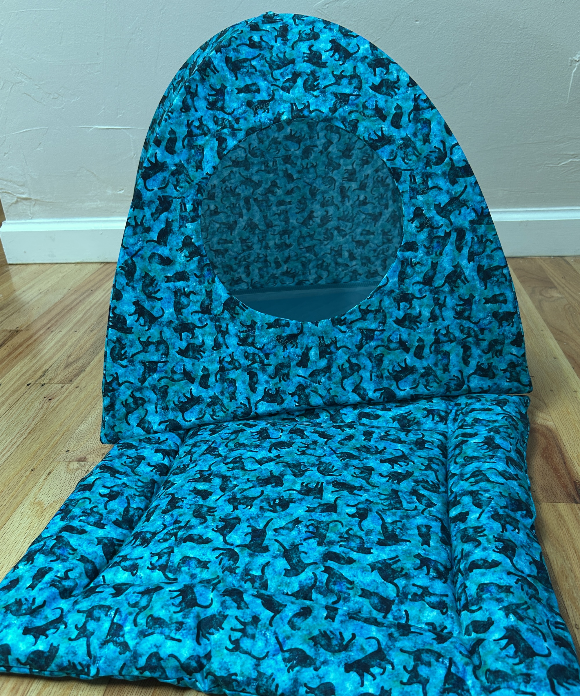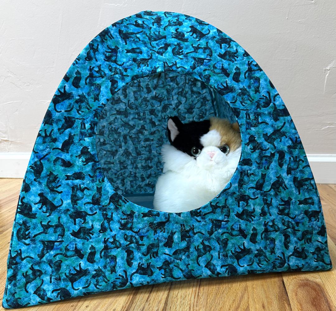 A multitude of cat fabrics adorn these large cat tents. The bottom is 16 inches square. Sturdy Carbon Fiber rods hold the top up. The interior bottom is double sided quilted in a coordinating solid color. Each tent comes with a removable/exchangeable tantalizing cat toy hung from the center top, to lure in your cat. The front opening has a granny square stitch embroidered pattern outline around the cat hole.  We work with 100% cotton quilting fabrics.