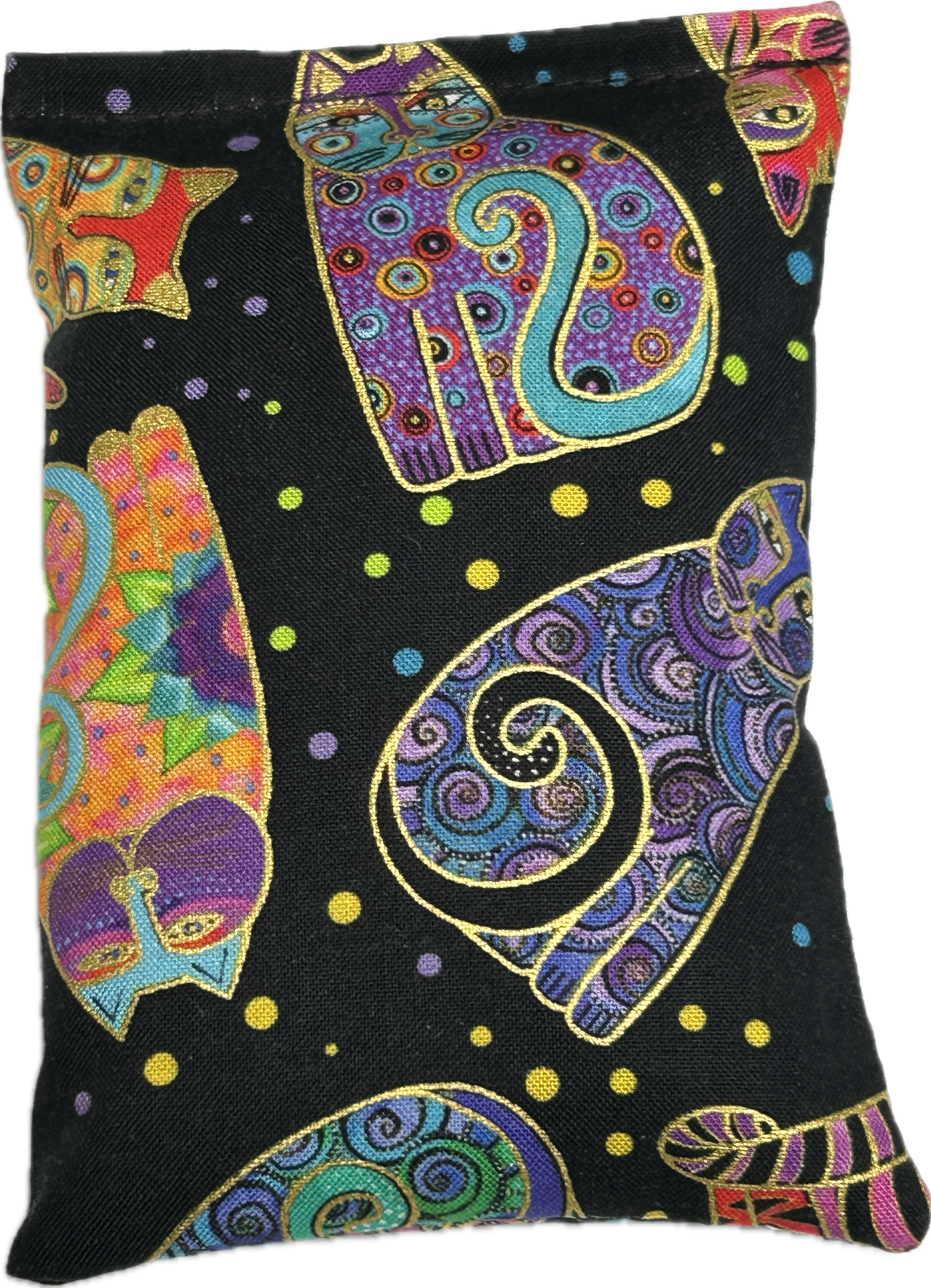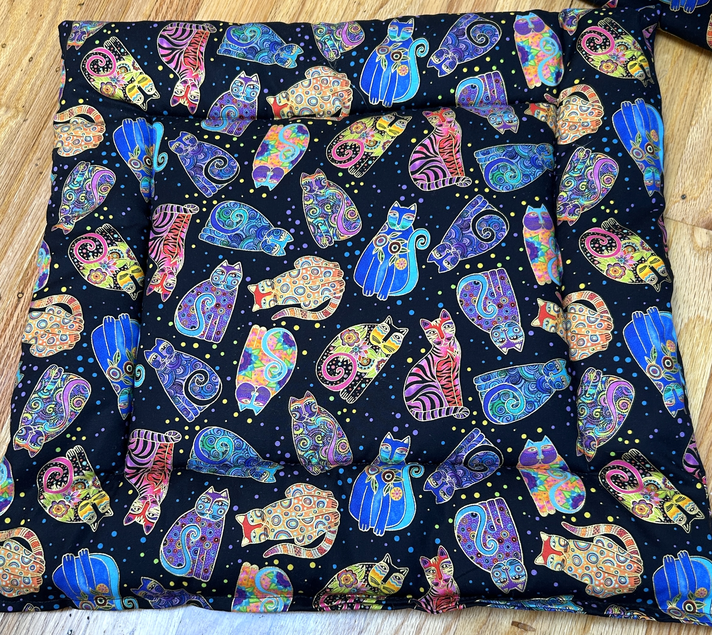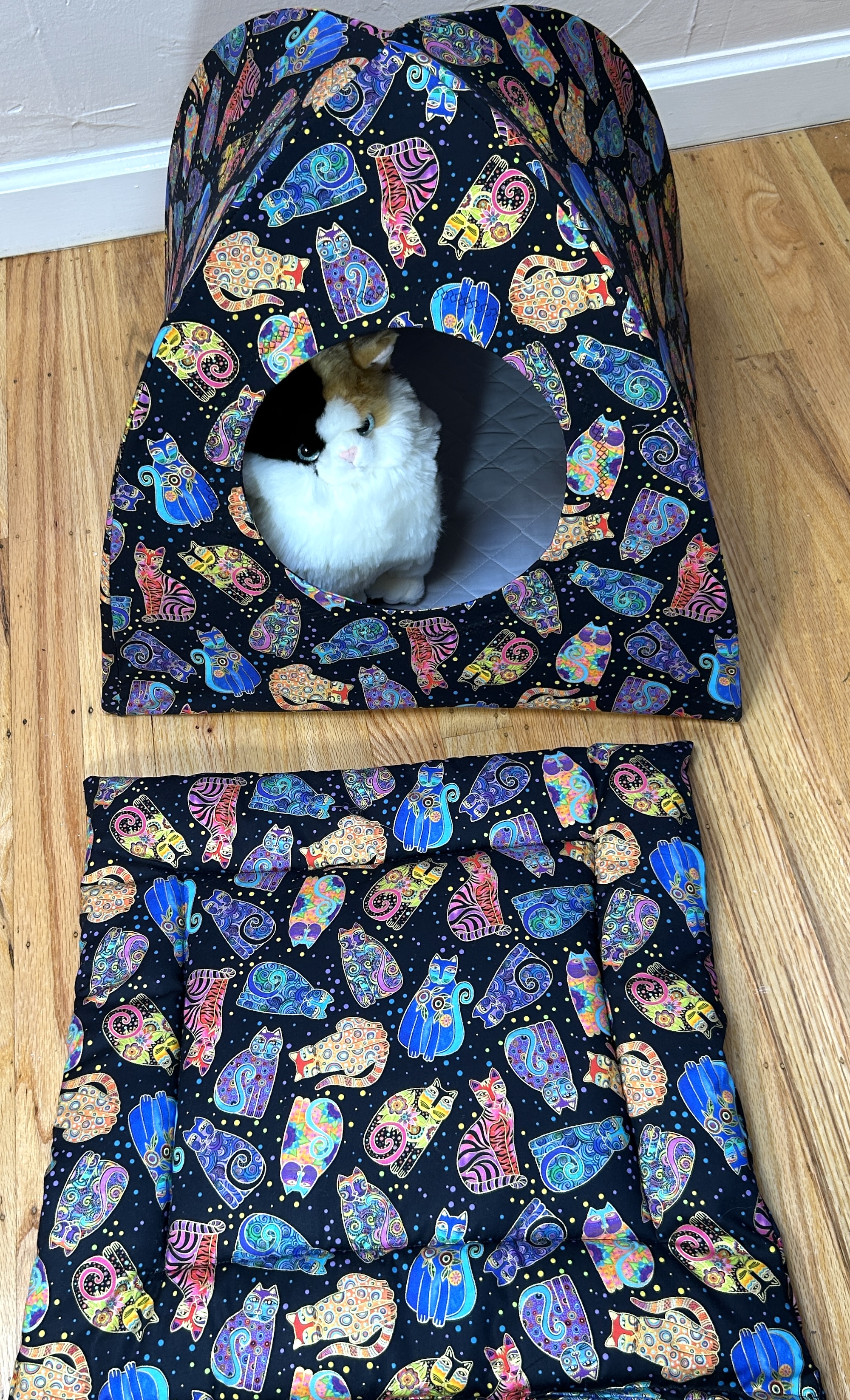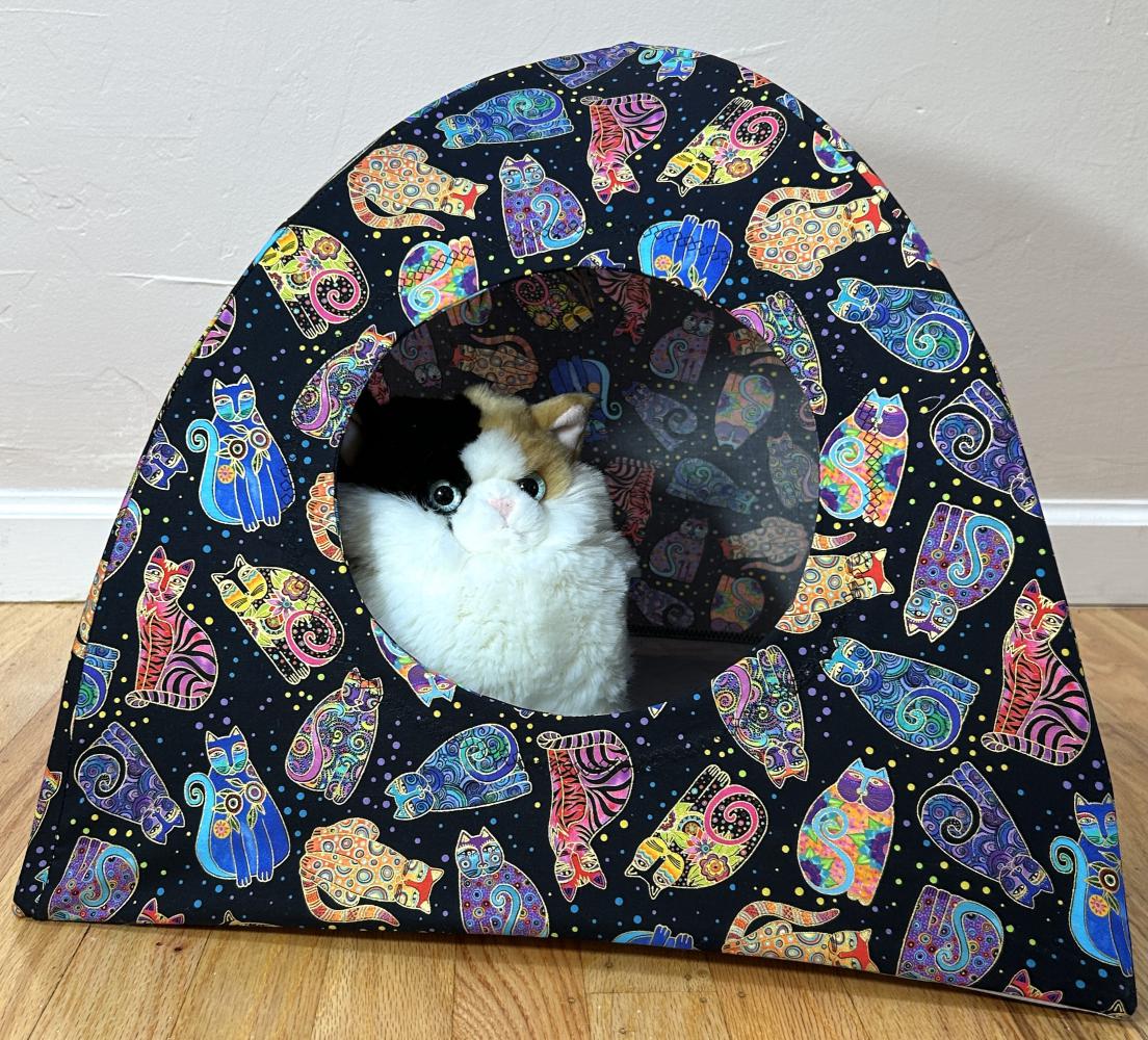 A multitude of cat fabrics adorn these large cat tents. The bottom is 16 inches square. Sturdy Carbon Fiber rods hold the top up. The interior bottom is double sided quilted in a coordinating solid color. Each tent comes with a removable/exchangeable tantalizing cat toy hung from the center top, to lure in your cat. The front opening has a granny square stitch embroidered pattern outline around the cat hole.  We work with 100% cotton quilting fabrics.