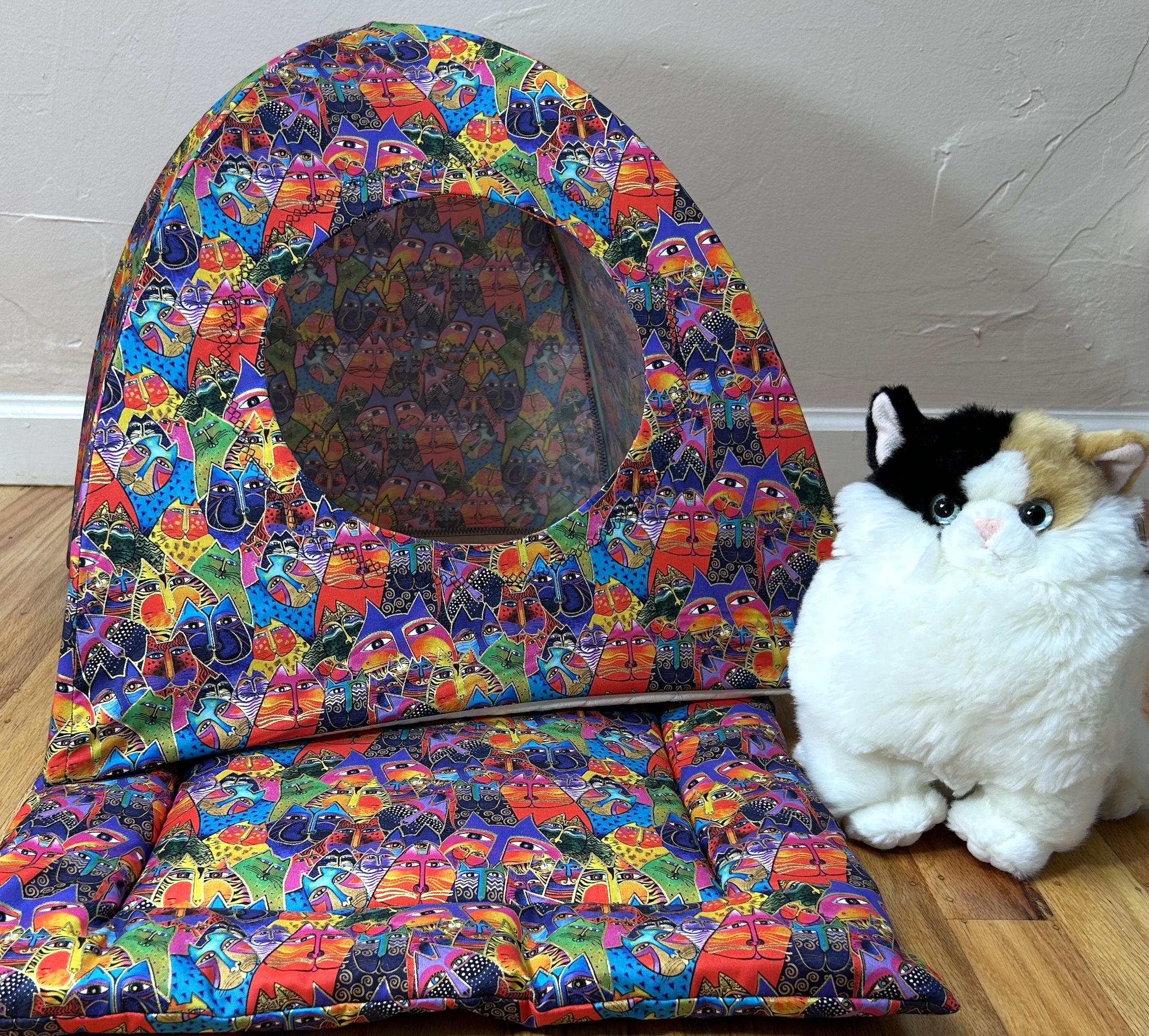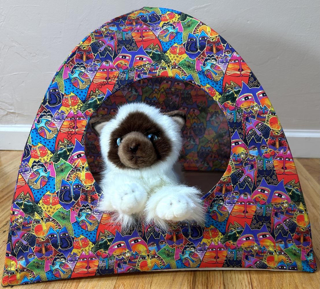 A multitude of cat fabrics adorn these large cat tents. The bottom is 16 inches square. Sturdy Carbon Fiber rods hold the top up. The interior bottom is double sided quilted in a coordinating solid color. Each tent comes with a removable/exchangeable tantalizing cat toy hung from the center top, to lure in your cat. The front opening has a granny square stitch embroidered pattern outline around the cat hole.  We work with 100% cotton quilting fabrics.