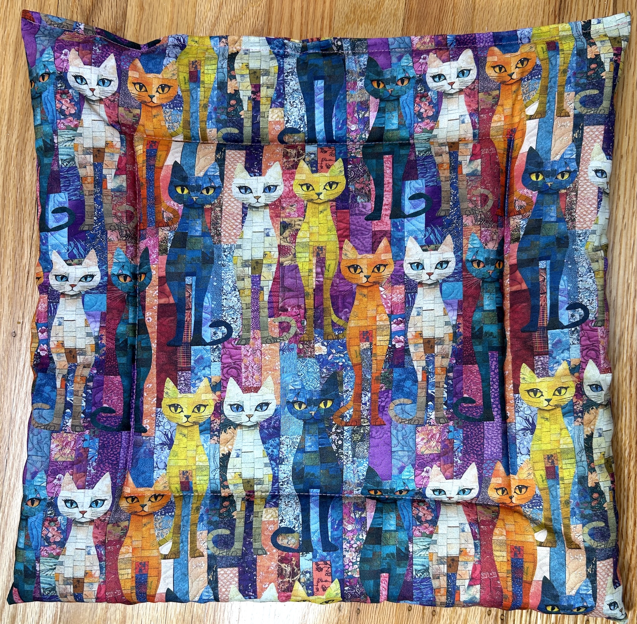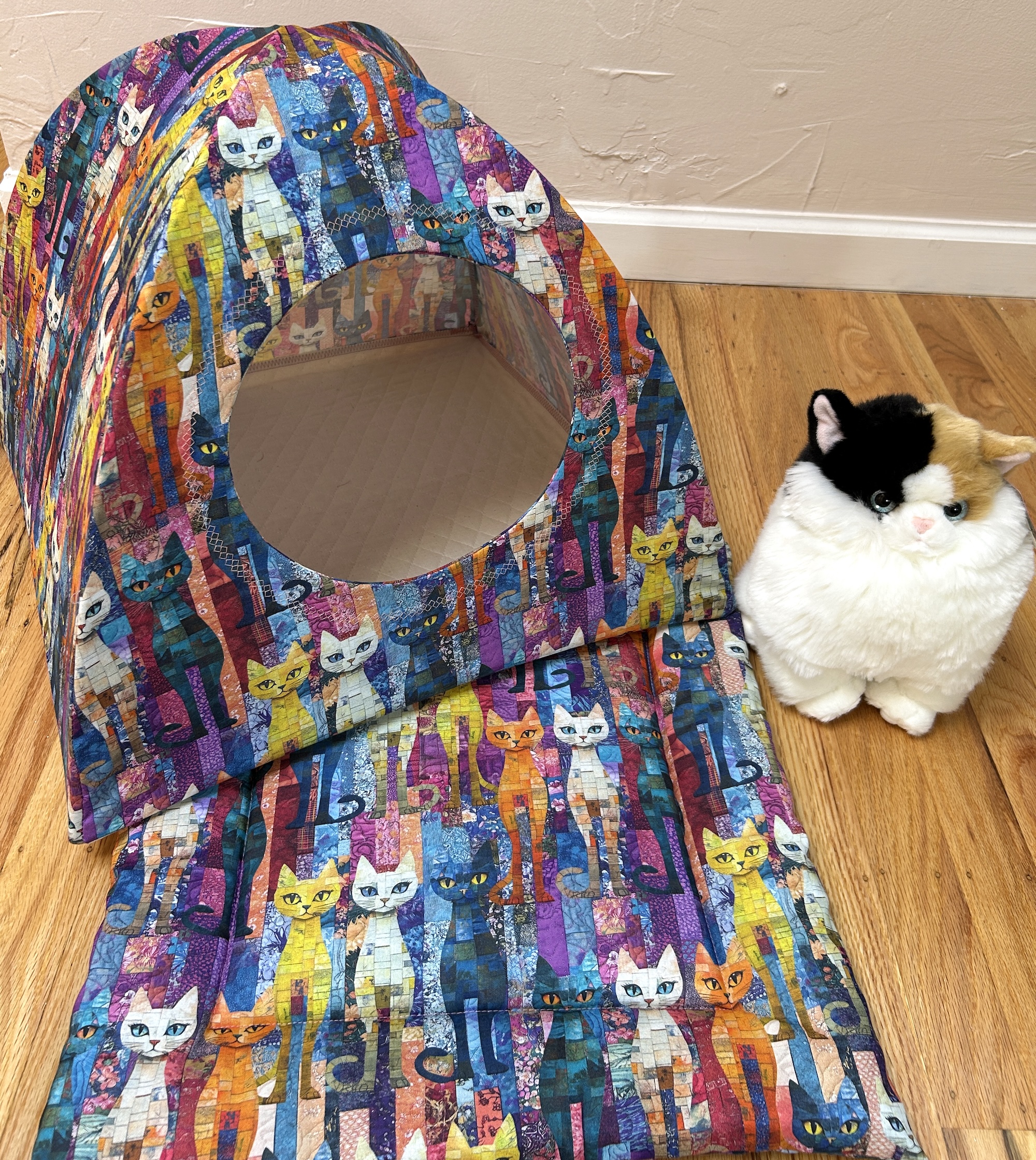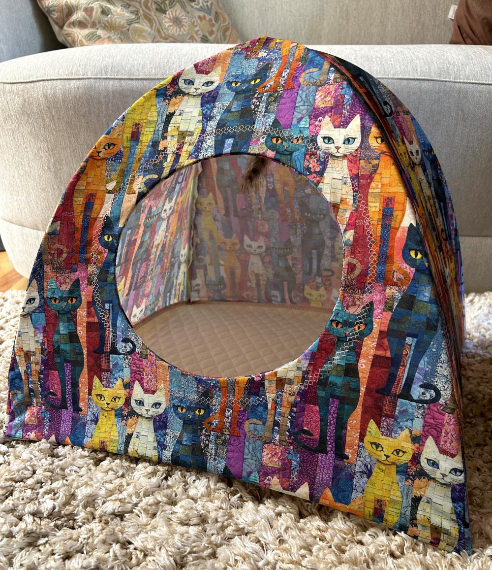 A multitude of cat fabrics adorn these large cat tents. The bottom is 16 inches square. Sturdy Carbon Fiber rods hold the top up. The interior bottom is double sided quilted in a coordinating solid color. Each tent comes with a removable/exchangeable tantalizing cat toy hung from the center top, to lure in your cat. The front opening has a granny square stitch embroidered pattern outline around the cat hole.  We work with 100% cotton quilting fabrics.